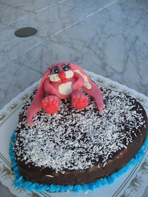 Smelt sjokoladen sammen med fettet og smør glasuren over kaken. Garner evt. med jordbær eller dryss kokosmasse over. Settes kjølig til glasuren er stivnet.