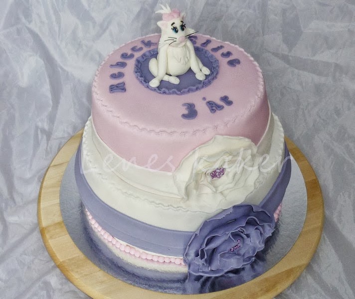 Sjokoladekake fylt med sjokolademousse, trukket med melkesjokoladekrem og marsipan. Det er masse lilla glitter på kjolen, men det synes ikke så godt på bildet ;-)